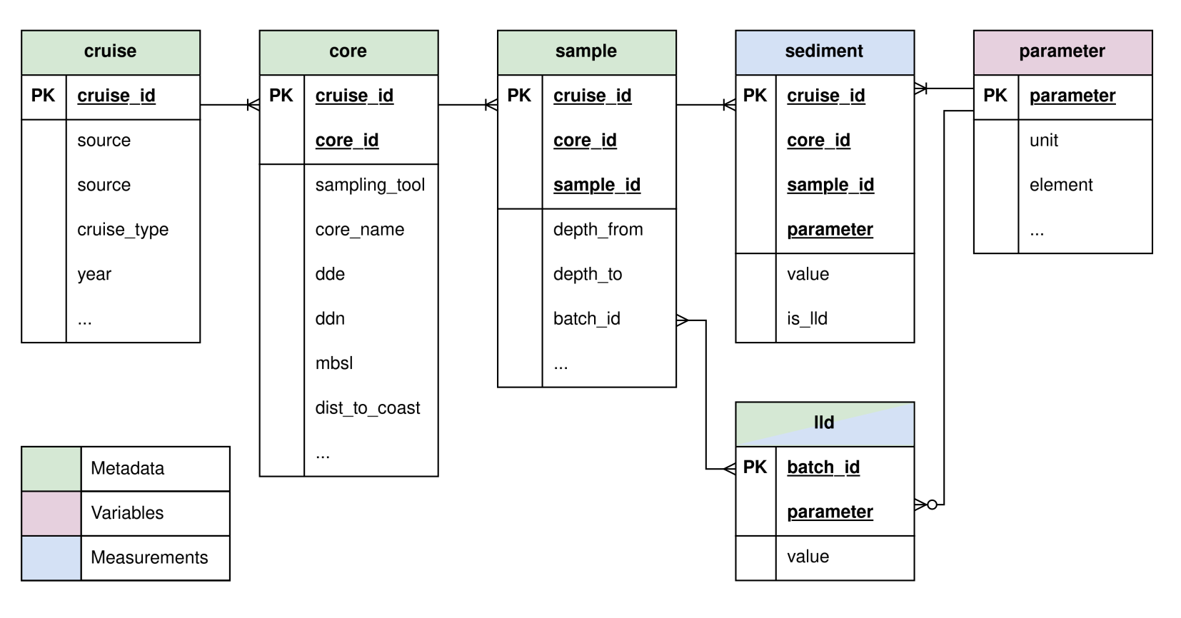 The columns with PK in the diagram indicate primary keys of the table, which guarantees unique identifications. All tables are connected by one-to-many relationships, except for the LLD table (lld). This table is optional for the parameter table but forms a many-to-many relationship with the sample table.