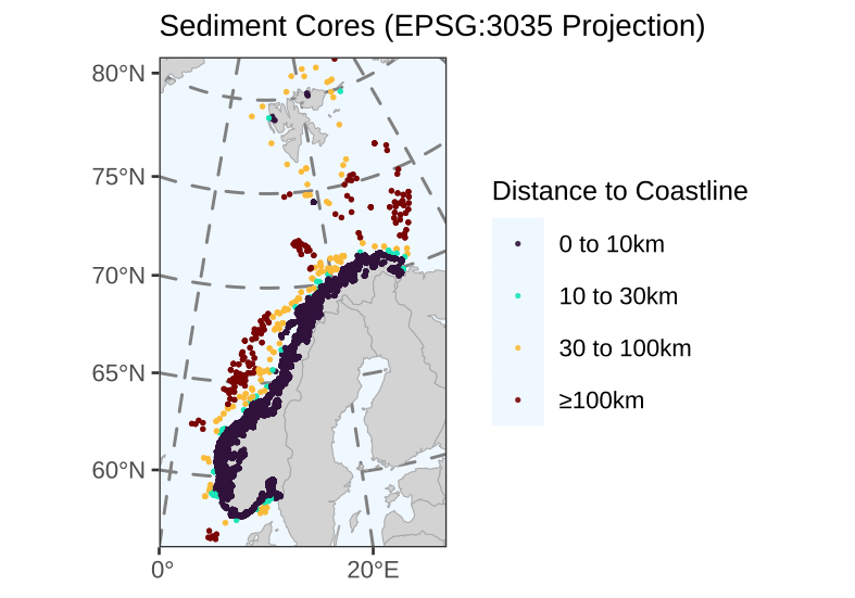 To ensure accurate measurements at high latitudes, where standard global projections (like Mercator) distort distances, all spatial data were projected to the ETRS89-extended Lambert Azimuthal Equal Area projection (EPSG:3035). This Coordinate Reference System is the standard for pan-European statistical mapping and minimizes distortion across the region. The shortest Euclidean distance from each sampling (core) site to the nearest Norwegian coastline geometry was then calculated in meters.